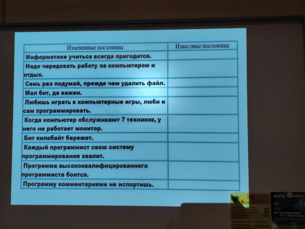 18 декабря состоялось внеурочное мероприятие по информатике в рамках недели цикловой комиссии. На мероприятии обучающиеся отвечали на вопросы, выполняли задание на сопоставление, расшифровывали высказывания, «узнавали» пословицы, разгадывали ребусы и загадки.